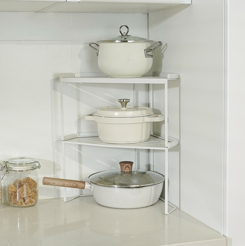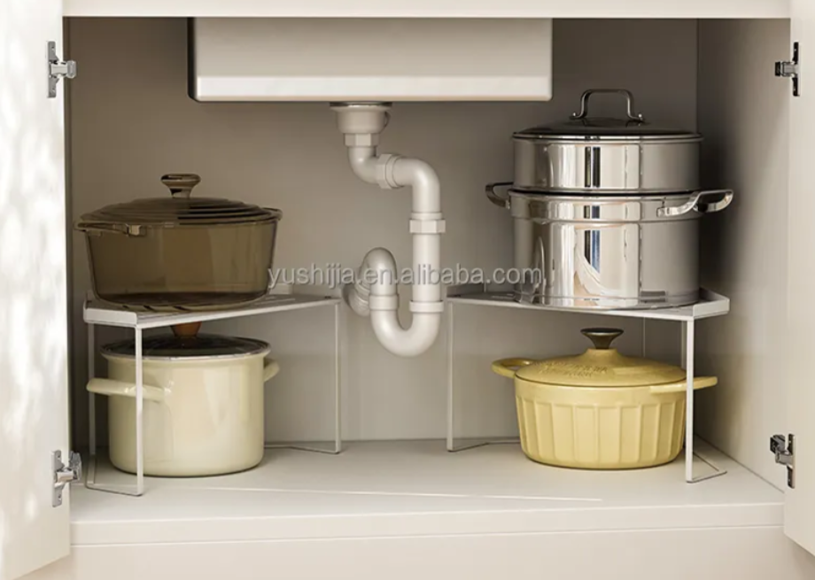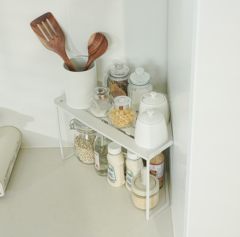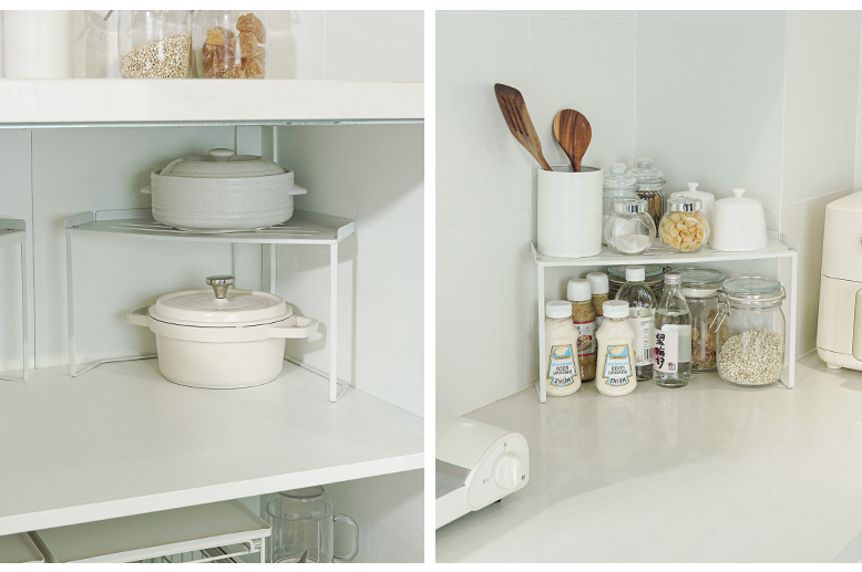 Su diseño en forma de triángulo se adapta a las esquinas, creando dos niveles de almacenamiento cuando se utilizan varios organizadores apilados. De esta manera, puedes multiplicar el espacio en tu cocina y mantener todo al alcance de la mano, desde condimentos y tarros pequeños hasta cazuelas y vajilla de uso diario.